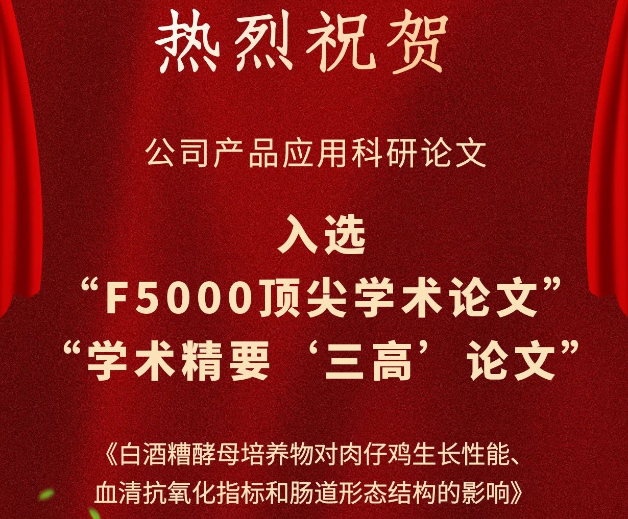 近日,公司產(chǎn)品應(yīng)用科研領(lǐng)域又聞佳訊傳來! 公司與中國農(nóng)業(yè)科學(xué)院飼料研究所家禽營養(yǎng)與飼料創(chuàng)新團(tuán)隊(duì)共同完成并發(fā)表于《動(dòng)物營養(yǎng)學(xué)報(bào)》(2019,31(5): 2357-2366)的學(xué)術(shù)論文—《白酒糟酵母培養(yǎng)物對(duì)肉仔雞生長性能、血清抗氧化指標(biāo)和腸道形態(tài)結(jié)構(gòu)的影響》,入選2022年度“領(lǐng)跑者5000—中國精品科技期刊頂尖學(xué)術(shù)論文(F5000)”和學(xué)術(shù)精要(2023年5-6月)高PCSI論文、高被引論文和高下載論文。 該論文探究了公司白酒糟酵母培養(yǎng)物對(duì)肉仔雞生長性能、血清抗氧化指標(biāo)和腸道形態(tài)結(jié)構(gòu)的影響。研究表明,飼糧添加白酒糟酵母