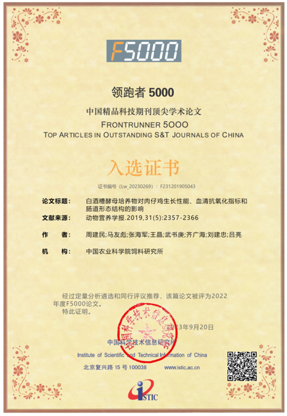 公司與中國(guó)農(nóng)業(yè)科學(xué)院飼料研究所家禽營(yíng)養(yǎng)與飼料創(chuàng)新團(tuán)隊(duì)共同完成并發(fā)表于《動(dòng)物營(yíng)養(yǎng)學(xué)報(bào)》(2019,31(5): 2357-2366)的學(xué)術(shù)論文—《白酒糟酵母培養(yǎng)物對(duì)肉仔雞生長(zhǎng)性能、血清抗氧化指標(biāo)和腸道形態(tài)結(jié)構(gòu)的影響》,入選2022年度“領(lǐng)跑者5000—中國(guó)精品科技期刊頂尖學(xué)術(shù)論文(F5000)”和學(xué)術(shù)精要(2023年5-6月)高PCSI論文、高被引論文和高下載論文。