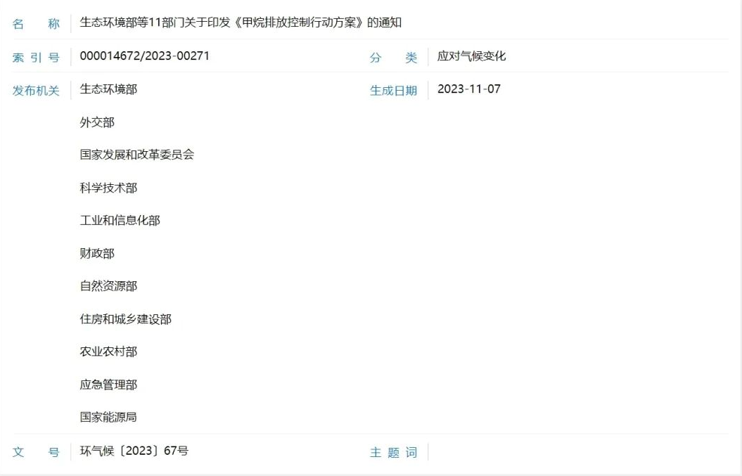 11月7日,生態(tài)環(huán)境部等11部門聯(lián)合印發(fā)《甲烷排放控制行動(dòng)方案》的通知,這是我國開展甲烷排放管理控制的頂層設(shè)計(jì)文件,明確提出了“十四五”和“十五五”期間甲烷排放控制目標(biāo)。