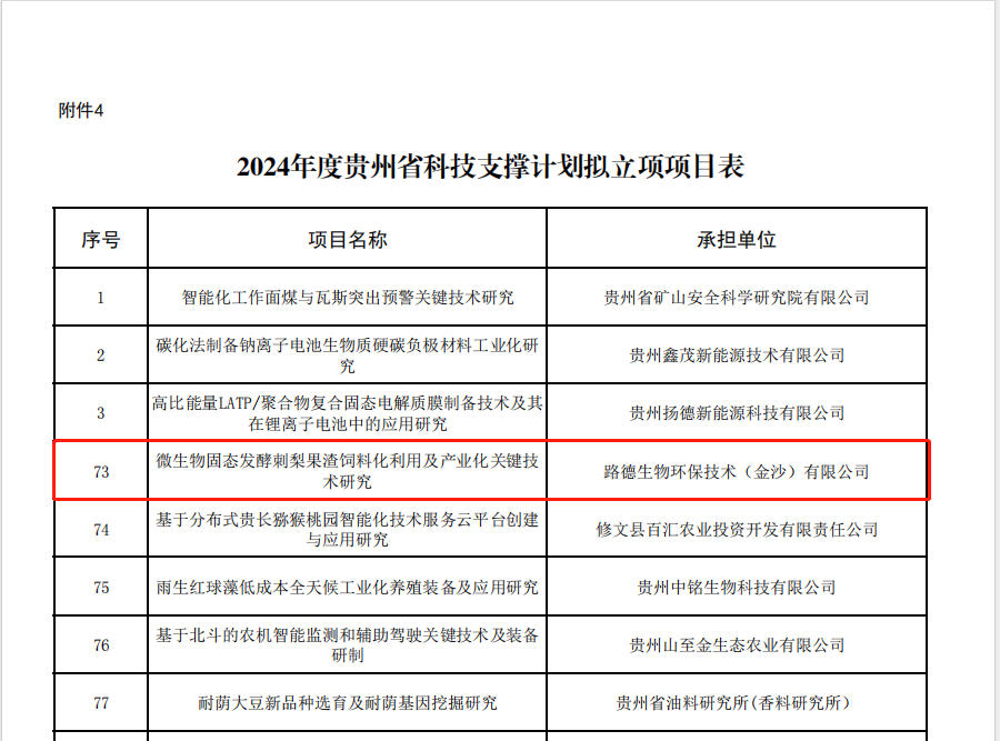 近日,貴州省科學(xué)技術(shù)廳公布了省科技計(jì)劃擬立項(xiàng)項(xiàng)目,路德環(huán)境旗下子公司——路德生物環(huán)保技術(shù)(金沙)有限公司承擔(dān)的“微生物固態(tài)發(fā)酵刺梨果渣飼料化利用及產(chǎn)業(yè)化關(guān)鍵技術(shù)研究”項(xiàng)目,入選“2024年度貴州省科技支撐計(jì)劃擬立項(xiàng)項(xiàng)目”。