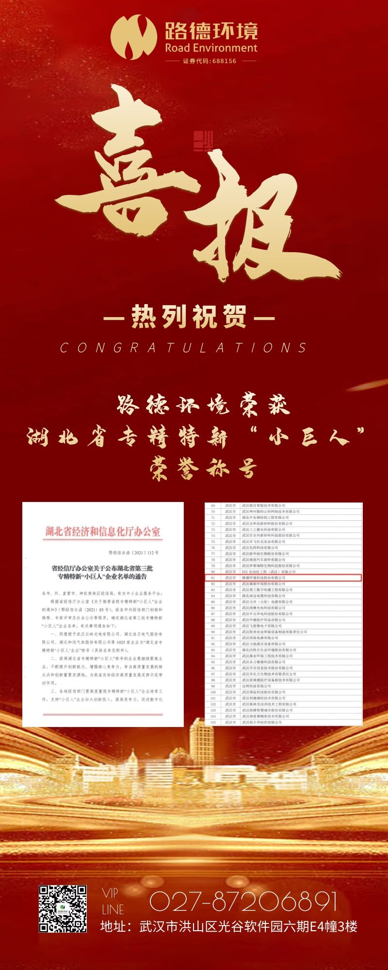 喜報(bào):路德環(huán)境榮獲2021年湖北省專(zhuān)精特新“小巨人”榮譽(yù)稱(chēng)號(hào)