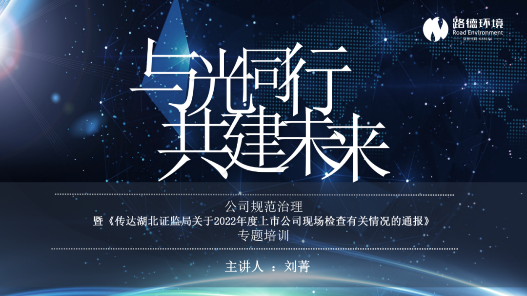 2月25日,為響應(yīng)湖北證監(jiān)局“進(jìn)一步提升轄區(qū)上市公司規(guī)范運(yùn)作水平,推動(dòng)高質(zhì)量發(fā)展”的號(hào)召,路德環(huán)境召開了“公司規(guī)范治理暨《傳達(dá)湖北證監(jiān)局關(guān)于2022年度上市公司現(xiàn)場(chǎng)檢查有關(guān)情況的通報(bào)》專題培訓(xùn)”活動(dòng)。