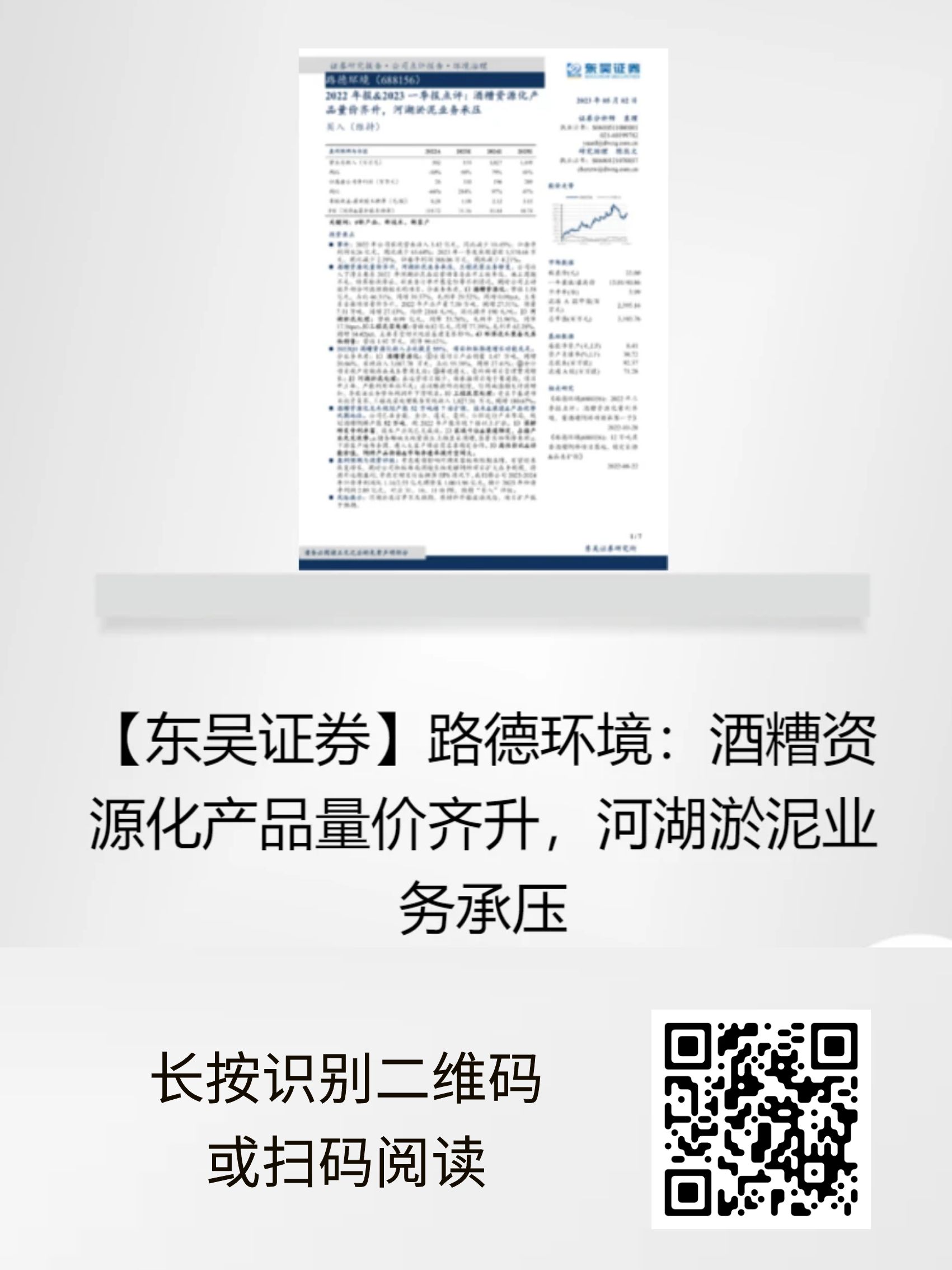 【點(diǎn)評(píng)報(bào)告】東吳證券點(diǎn)評(píng)路德環(huán)境:酒糟資源化產(chǎn)品量?jī)r(jià)齊升,河湖淤泥業(yè)務(wù)承壓