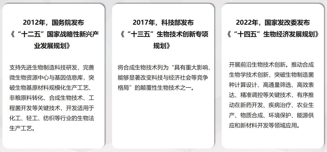 在我國,從“十二五”國家提出支持先進(jìn)生物制造科技研發(fā),到“十三五”國家將合成生物技術(shù)列為引領(lǐng)產(chǎn)業(yè)變革的顛覆性技術(shù)之一,再到“十四五”明確表示“要有序推動(dòng)合成生物技術(shù)在新藥開發(fā)、疾病治療、農(nóng)業(yè)生產(chǎn)、物質(zhì)合成、環(huán)境保護(hù)、能源供應(yīng)和新材料開發(fā)等領(lǐng)域應(yīng)用”,一直以來,隨著國家持續(xù)出臺(tái)政策予以大力支持,我國合成生物產(chǎn)業(yè)擁有廣闊的發(fā)展前景。