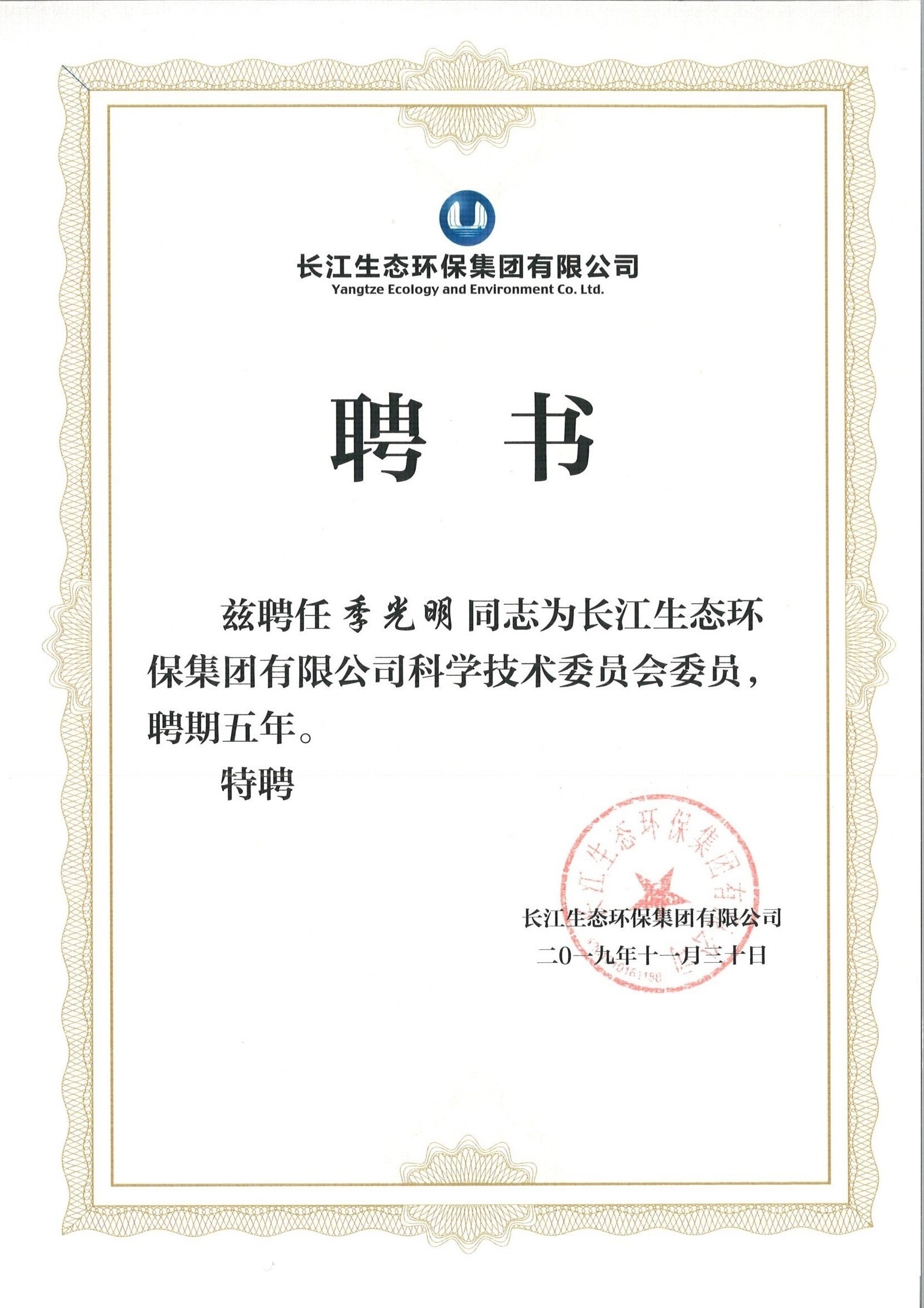 季光明董事長獲聘長江生態(tài)環(huán)保集團有限公司科學技術(shù)委員會委員