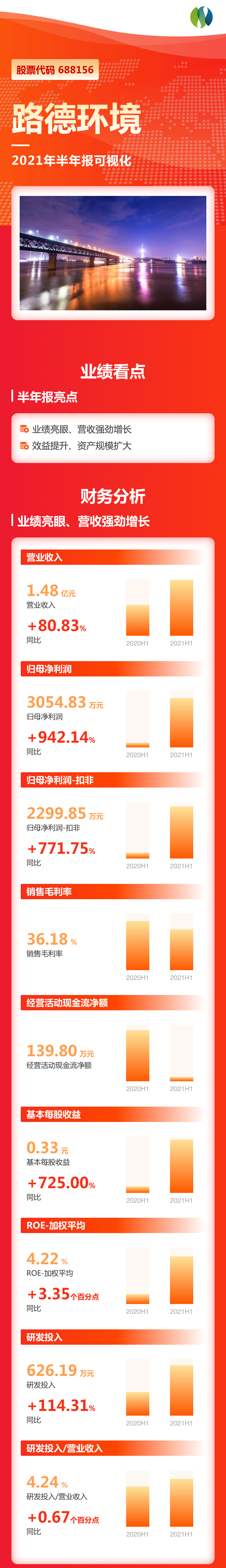 8月19日,路德環(huán)境發(fā)布2021年半年報,上半年,公司實(shí)現(xiàn)營業(yè)收入14785.15萬元,同比增長80.83%;歸屬于上市公司股東的凈利潤3054.83萬元,同比增長942.14%。